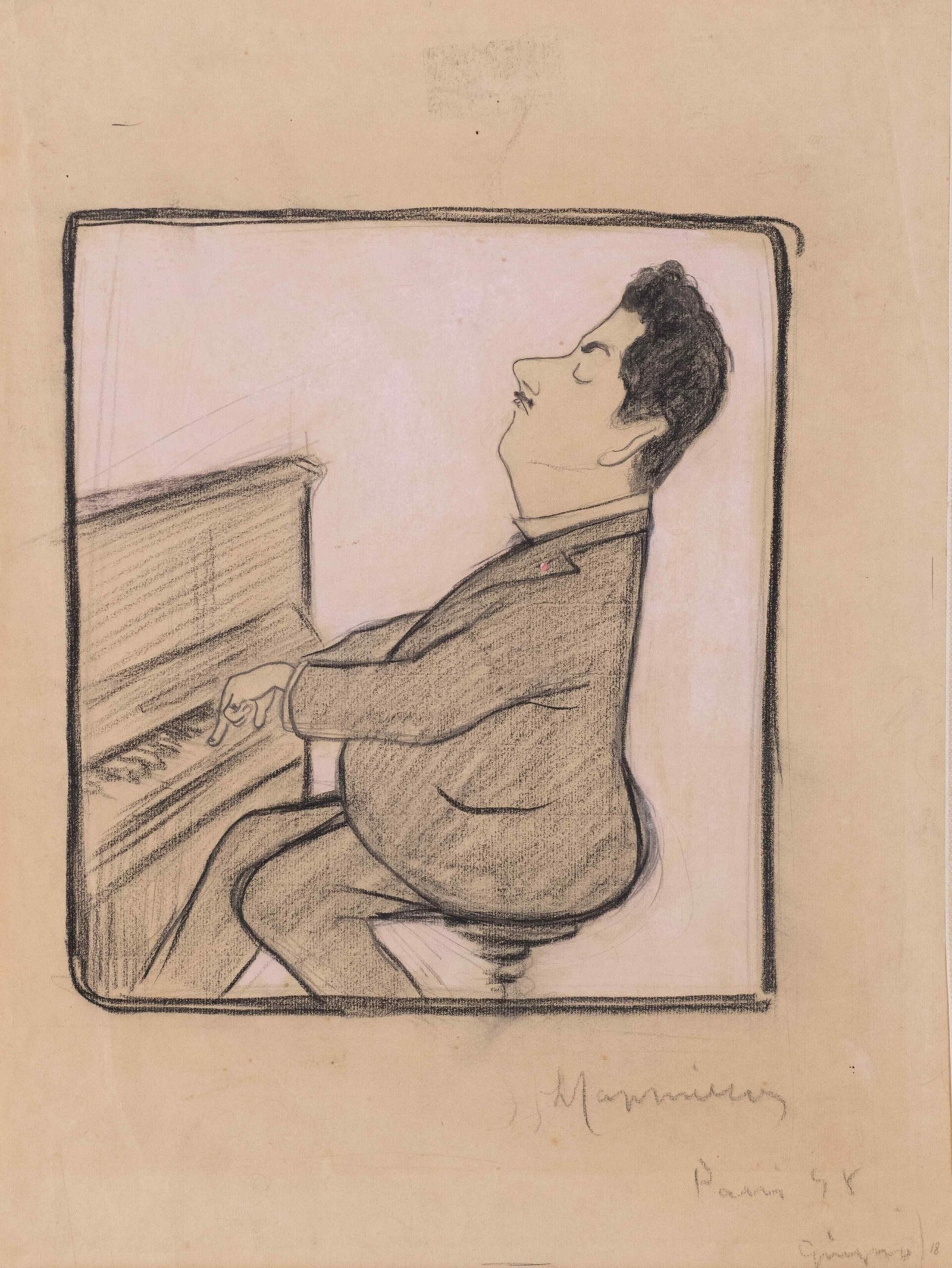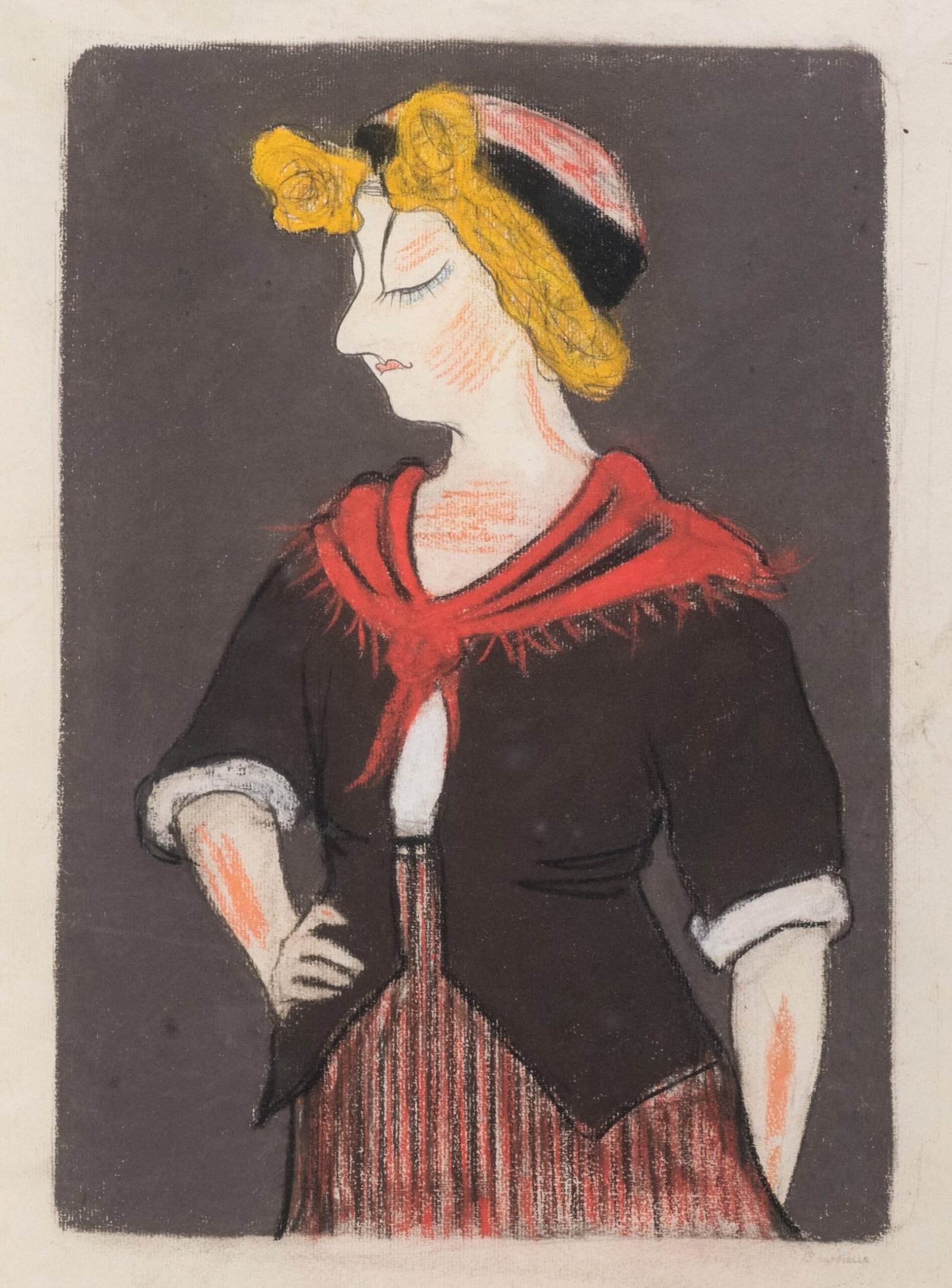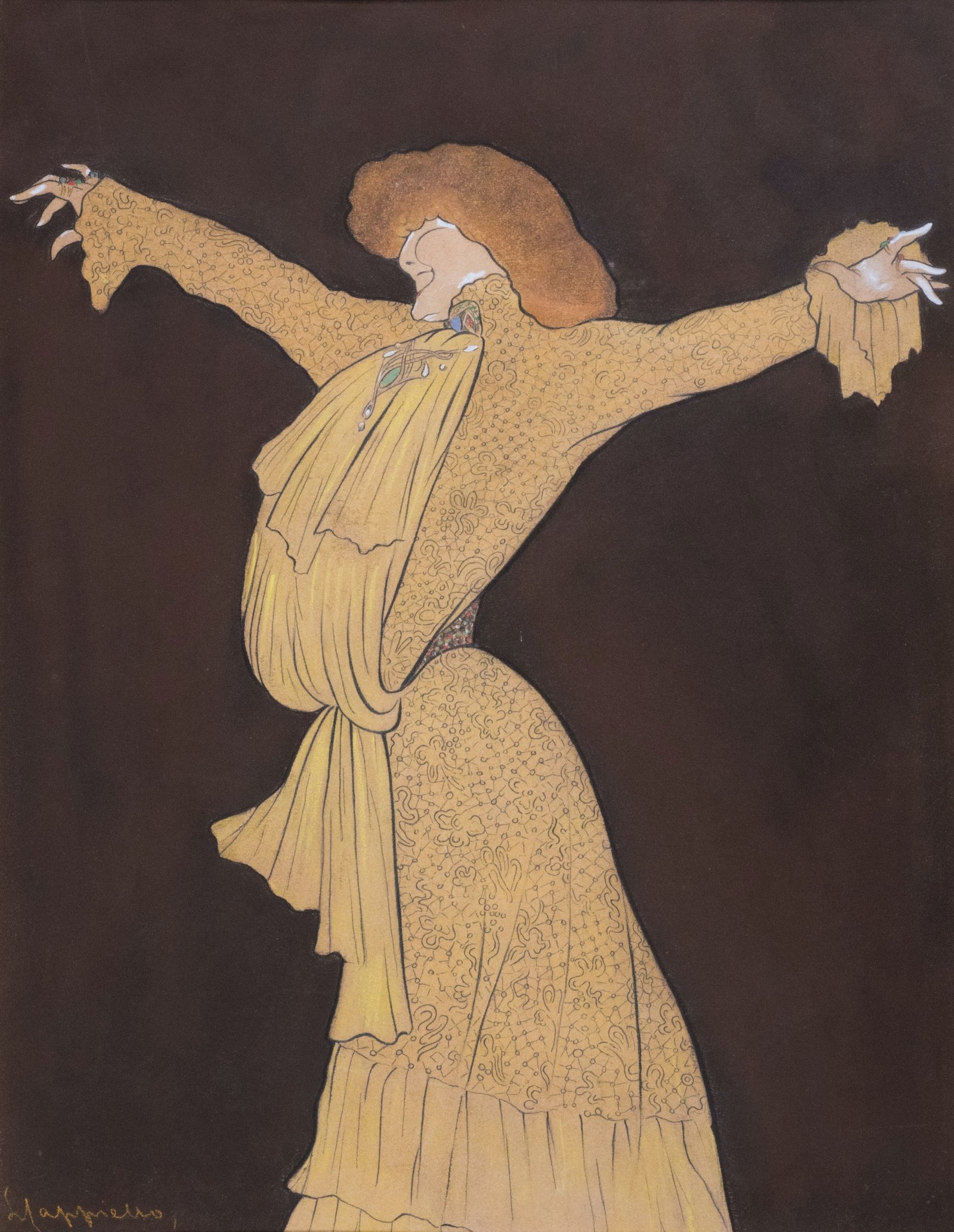 في الصالة الأولى من المعرض، نرى كيف اهتم كابييلو بمجتمع الفنون المشهدية، والمسرح على وجه الخصوص، فور وصوله إلى باريس، تاركاً لرسامي الكاريكاتير الآخرين في المدينة مهمة السخرية من أخلاق زمنهم وشخصياته. نرى أيضاً كيف تمكن، منذ أن حط في عاصمة “الأنوار”، من تمييز نفسه عن “زملائه” في المهنة، بأسلوبه الذي تتجلى كل صفاته في البورتريه الذي رسمه عام 1898 للممثلة المسرحية الشهيرة آنذاك، ريجان، ونشر على الصفحة الأولى من صحيفة “الضحك” الساخرة. أسلوب لا يكفي أن نذكر خطه المصفى وألوانه المسطحة لتفسير فتنته، لكنه يقف خلف النجاح السريع الذي حصده صاحبه، وأدى إلى جمع رسومه في العام التالي داخل ألبوم بعنوان “ممثلاتنا” تتجاور فيه بورتريهاته لنجوم المسرح الكبرى (ساره برنار، مارت برانديس، أندريه ميغار، مارت ميلو…) مع تلك التي رصدها لممثلات صاعدات. رسوم تظهر قامات تلك الممثلات فيها محاطة بخط أسود رفيع وواضح، ومعززة بألوان زاهية مسطحة، وركز كابييلو فيها على الوقفة الخاصة لكل ممثلة، وطبعها، من دون أي ديكور أو تفصيل زائد في التشكيل، واضعاً خطه الرشيق كلياً في خدمة شخصيتها، فتغنى النقاد بأسلوبه التشخيصي الساحر بقدر ما هو دقيق، وأطلقوا عليه صفة “سيد الكاريكاتير”، ولم يكن قد تجاوز بعد سن الـ24.