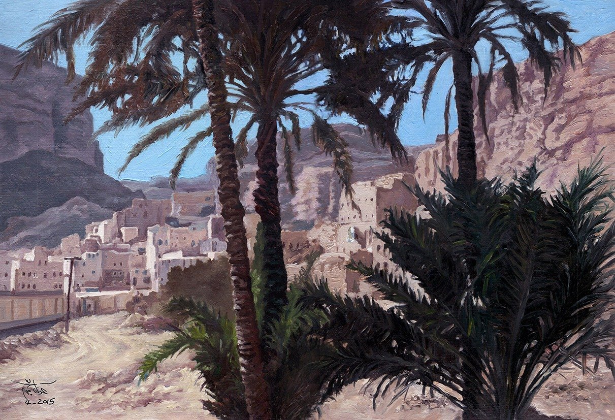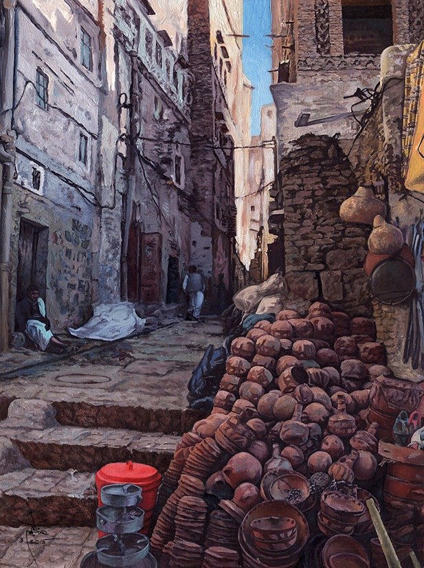 رسم الفنان اللوحة على قماش أصلي وسميك، قام بمعالجته بنفسه؛ كما أكّد ذلك، واستخدم ألوانًا زيتية متعددة؛ وذلك لإظهار التفاصيل غير المحدودة في الصورة التي رسمها على مقاس كبير (مترين في متر ونصف)، وهو المقاس الأكبر الذي رسمه الفنان في مسيرته الإبداعية، وقد حاكى تفاصيل لا معدودة من مدينة صنعاء القديمة.
