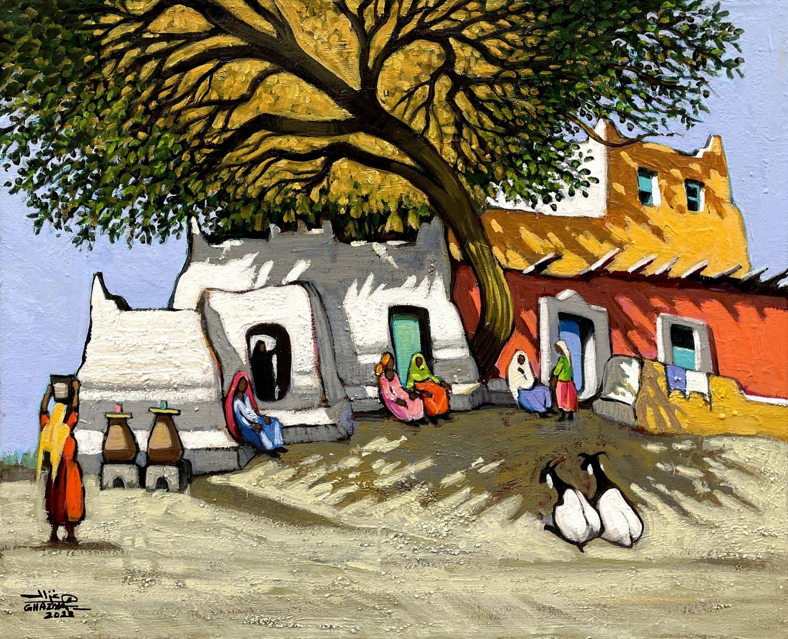 جمعت الأعمال ما بين الواقعية والتجريدية وتنوعت مقاساتها ما بين متر ومتر ونصف، جسدت بعضها الطيور مثل «أبو قردان»، واحتفى بعضها الآخر بجمال المساحات الخضراء الممتدة والنخيل والأشجار الكثيفة، لكنها في النهاية تلاقت في تعبيرها عن جمال الحياة الريفية البسيطة.