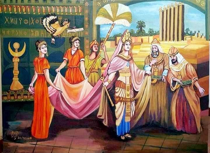 بينما ألوان الملابس وألوان المكان يدل على العظمة والمكانة والرفعة والثراء والخلفية تظهر أعمدة العرش محاطة باللون الأخضر لون الطبيعة الخلابة وهذا فيه دلالة على تطور الزراعة والإنتاج وخصوبة الأرض