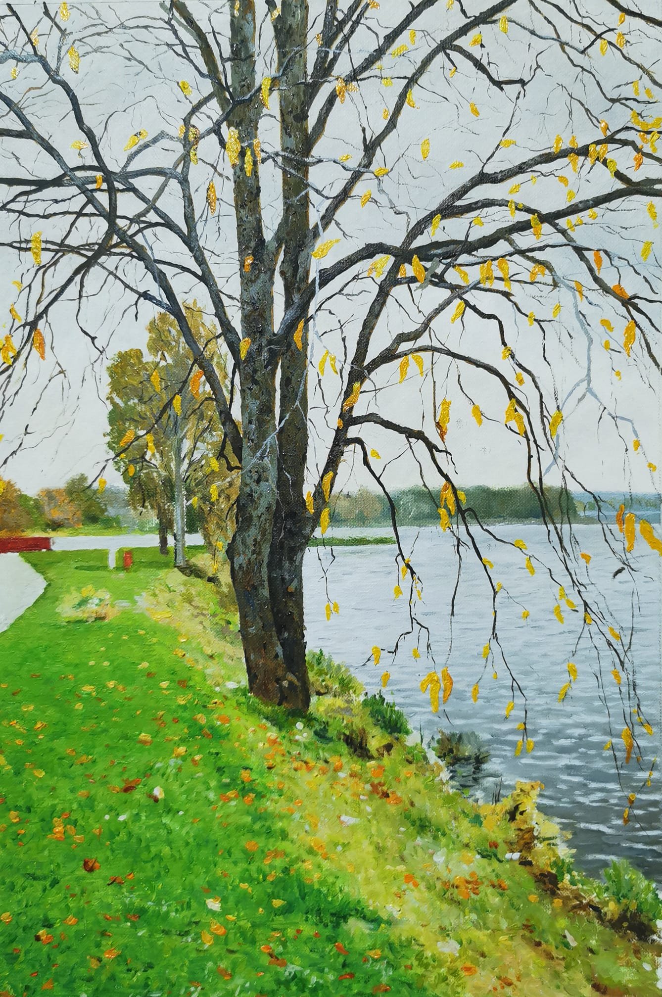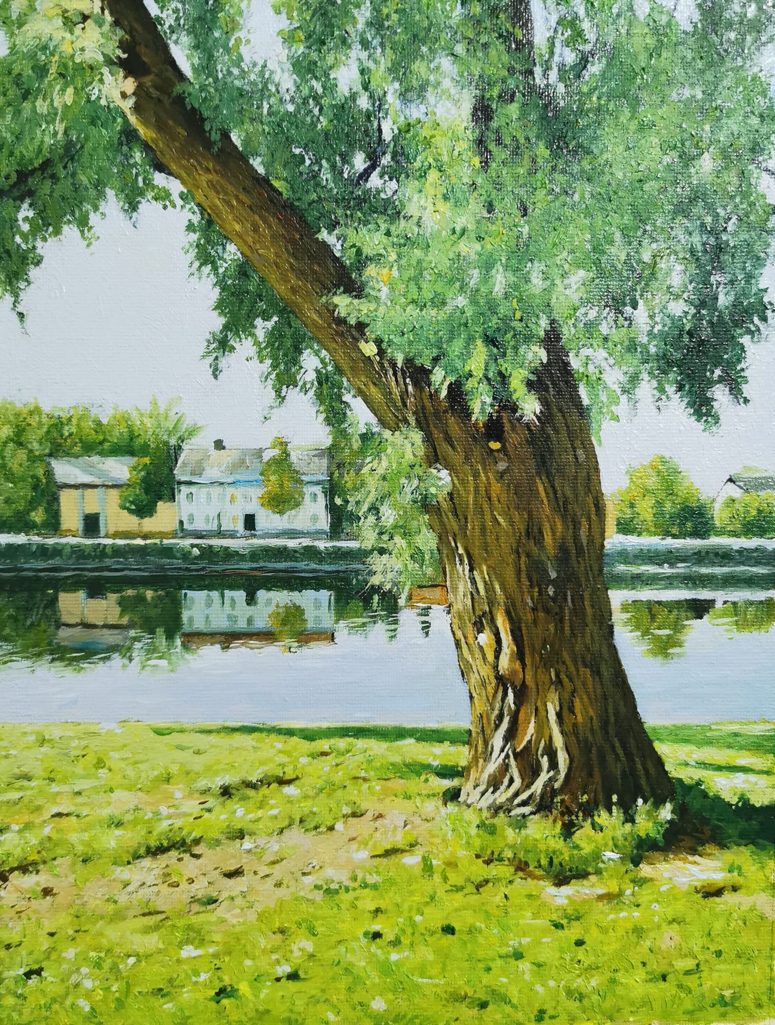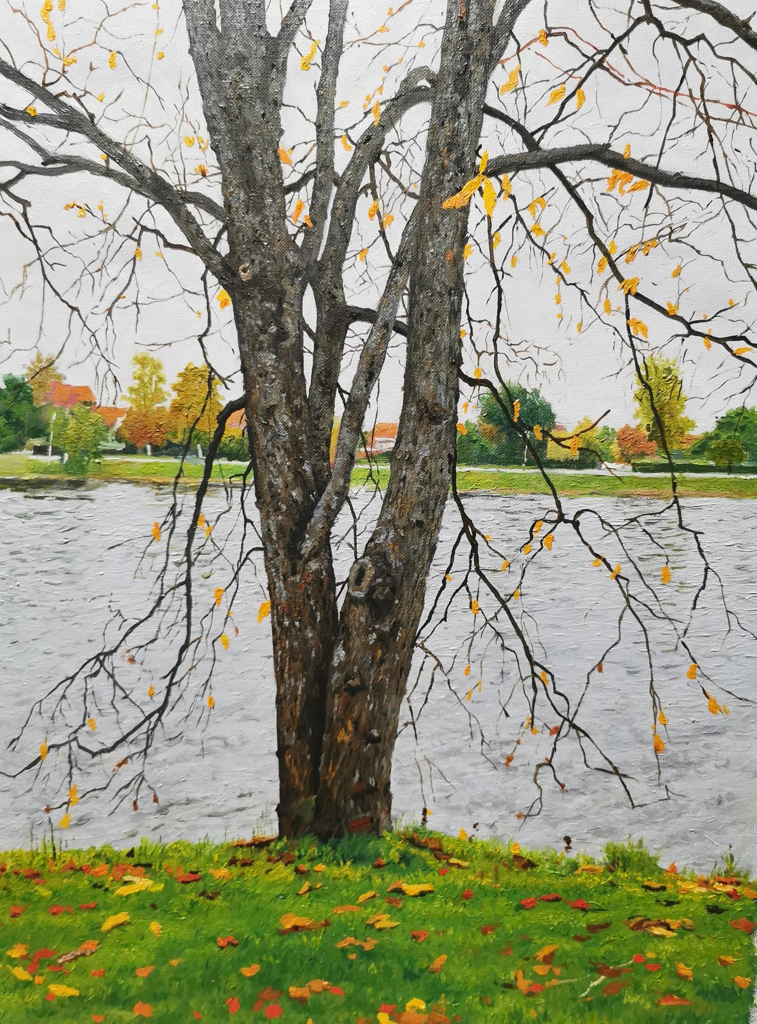 أما اللوحة الثالثة من سلسلة كارلستاد فيمكن القول إنطلاقا من حيثياتها اللونية أن لا شيء يمكن أن يجسد مقولة أن الجمال هو ما نخلعه من أنفسنا على الأشياء مثل لوحة الفنان، فلهب الروح المنفوخ في اللوحة يُظهر تفاصيل النفس ودواخلها.. حيث يظهر جمال روح الفنان طلال متجسدا في خضرة شجرة الربيع سماحة وأخلاقا وسكينة ماء البحيرة والأفق الفسيح عقلا وإدراكا وتقديس العائلة رغم البعد.. وكيف لا؟ ألسنا نحن مزيج من مكونات هذا الوجود!